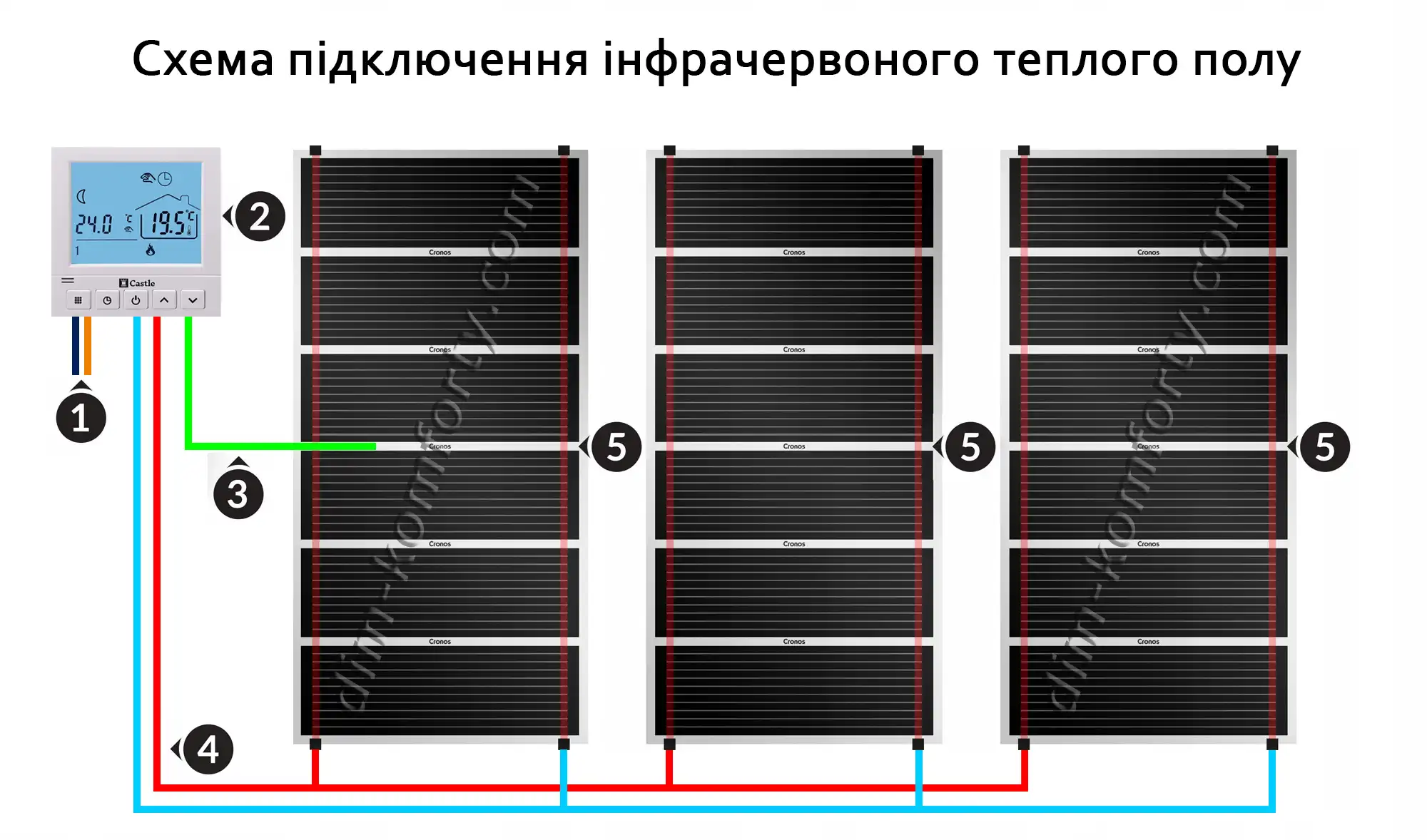 - Терморегулятор встановіть на стіні, підключіть до нього дроти від плівки та мережі.